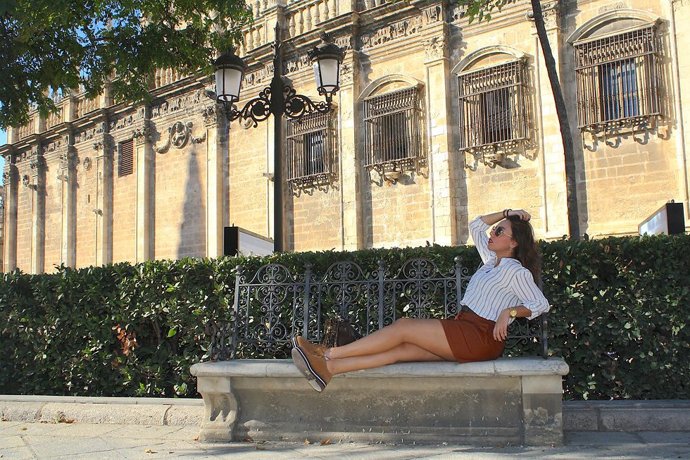 El otoño es una estación del año en la que nos volvemos locos sin saber que ponernos, ya que por las mañanas empieza a refrescar, pero luego durante el día hace calor. Aunque la verdad es que aquí por el sur sigue haciendo muy buen tiempo, se nota que ya por las noches refresca bastante. Es cierto que se va agradeciendo un poquito de frío: el placer de taparte el primer día con el edredón, poder ponerte jerseys, botas, etc.. y, ¿hay algo mejor que los tonos tierra para el otoño? Para mí el otoño siempre se ha caracterizado por tonos marrones, beiges, grises.. y me encantan combinarlos entre ellos. Y hoy os traigo un look con estos tonos: una falda marrón con los detalles de los botones dorados de Marwa, una camisa blanca a rayas beige y negras de Primark; me decanté por esta camisa porque me parece ideal y quería jugar con los contrastes y no hacer un look muy monótono. Y por último unos zapatos con plataforma marrones que me tienen enamorada. En cuanto complementos llevo un bolso con un forrado de leopardo de Michael Kors, un reloj marrón camel y como pendientes mis fieles amigos los aros. Es cierto que para ser otoño es un look bastante fresco, pero el finde que pude escaparme a Sevilla seguía haciendo altas temperaturas y por ello, opté por un look otoñal a conjunto con las temperaturas.